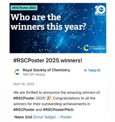 Öznur Safgöl, RSC Poster 2025 Yarışması’nda RSC Nano kategorisinde 2. olmuştur!